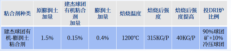 方法:鐵精礦粉中加入建杰球團(tuán)有機(jī)粘合劑與部分膨潤土混勻后,利用圓盤造粒成型技術(shù),制備成強(qiáng)度合適的球團(tuán),經(jīng)焙燒成鐵礦球團(tuán)再投爐使用。